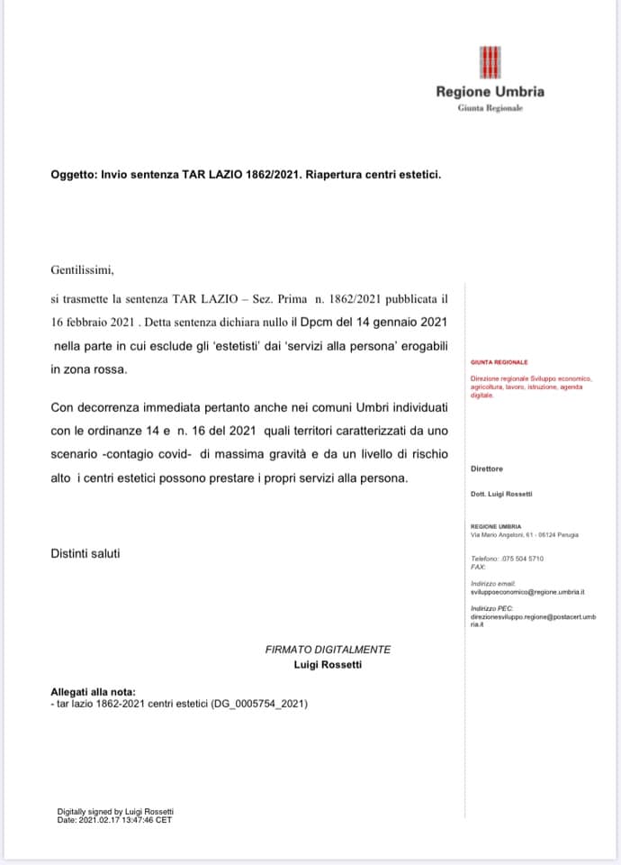 Stampa Condividi Facebook Twitter Whatsapp Telegram Email Comunicazione sentenza TAR del Lazio riguardo la riapertura dei centri estetici Allegati: File Comunicazione sentenza TAR del Lazio riguardo la riapertura dei centri estetici 1.jpg Comunicazione sentenza TAR del Lazio riguardo la riapertura dei centri estetici 2.jpg