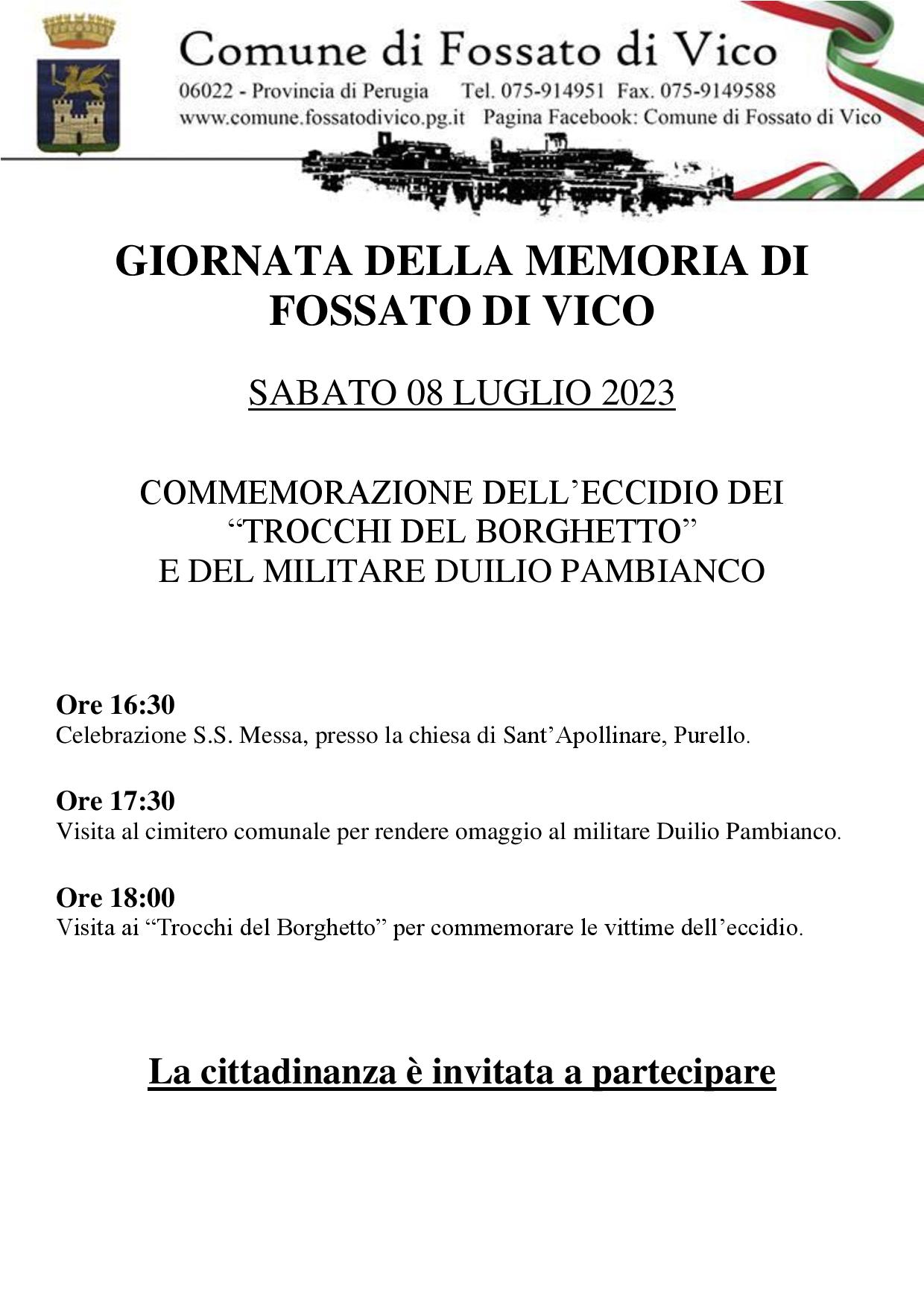 Stampa Condividi Facebook Twitter Whatsapp Telegram Email Giornata della Memoria di Fossato di Vico - 8 luglio 2023